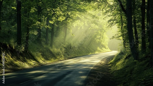 A tranquil winding road through a lush green forest illuminated by soft morning sunlight in the early hours of the day