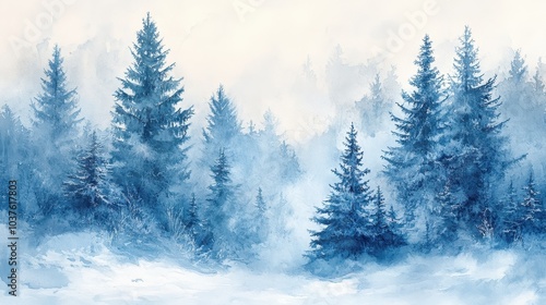 A tranquil winter morning in an evergreen forest with tall spruce and pine trees blanketed in soft snow under a serene blue sky