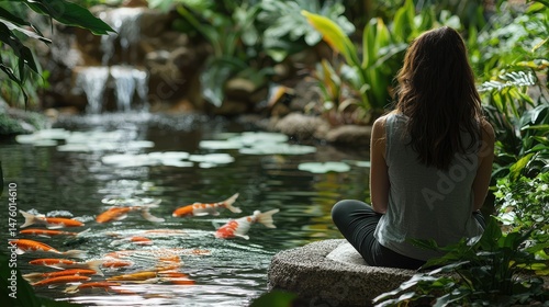 A tranquil woman sitting beside a peaceful koi pond in a spa garden, surrounded by lush greenery, enjoying a calming moment.