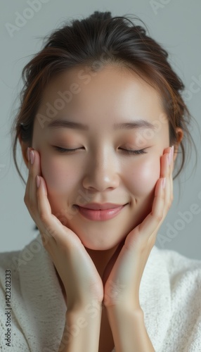 A tranquil young woman with closed eyes radiates peace as she softly cradles her face with her hands. Her serene expression and natural beauty evoke a sense of calm and self-care, inviting viewers to