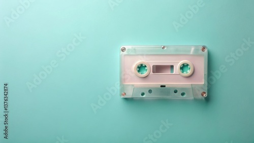 A translucent audio cassette tape rests on a pastel background, a nostalgic symbol of bygone musical eras