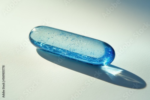 A translucent blue glass capsule-shaped object with air bubbles rests on a white surface, casting a shadow.