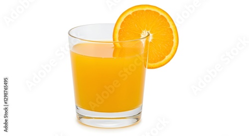 A transparent glass filled with fresh orange juice, with a slice of orange on the rim, placed on a white background