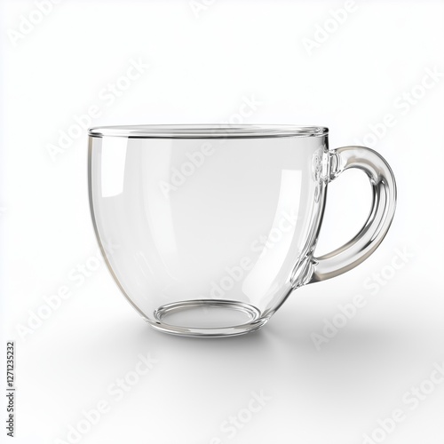 A transparent glass tea cup smooth curved handle rounded body high-quality clear glass light reflections subtle highlights pure white background.