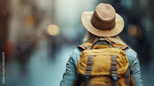A traveler wearing a hat and a yellow backpack walks through a bustling city street, representing exploration, wanderlust, and the vibrant energy of urban environments.