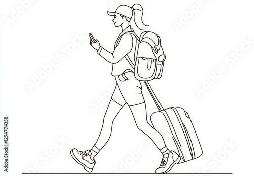 A traveler with their luggage depicted in a single, unbroken line drawing