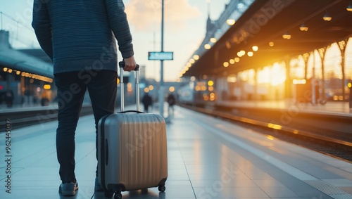 A Traveler's Anticipation: Awaiting Departure at a Beautifully Lit Train Station During Sunset, the Mood Captured with Vibrant Colors and a Sense of Adventure and Journey Ahead.