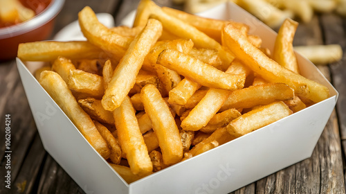 A tray filled with golden-brown French fries, perfectly seasoned and crisp, offering a delightful combination of salty flavor and crunch, ideal as a snack or side dish