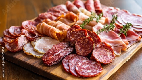 A tray of assorted cured meats, including prosciutto, salami, and chorizo, on a wooden platter.