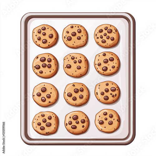 A tray of chocolate chip cookies fresh out of the oven, perfectly golden brown and crispy. A delicious homemade dessert