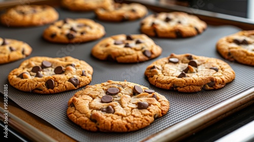 A tray of freshly baked chocolate chip cookies cooling on a baking sheet.