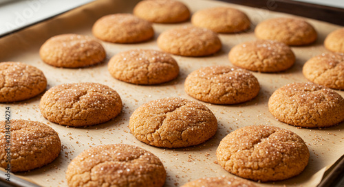 A tray of freshly baked keto snickerdoodle cookies with a golden, cinnamon-dusted crust, artfully arranged on a parchment-lined baking sheet