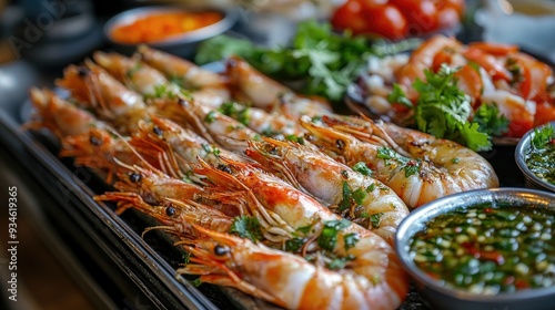 A tray of grilled shrimp prawns with fresh veggies and seafood sauce, perfect for a Thai seafood buffet. The vibrant presentation emphasizes the rich flavors and freshness.