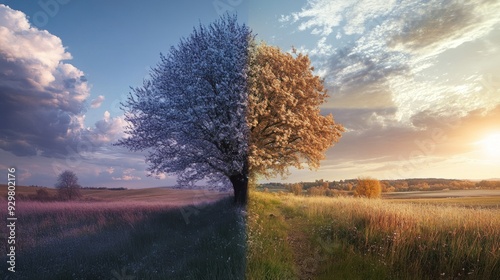 A Tree Divided by Two Contrasting Skies and Landscapes