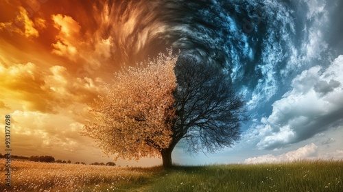 A tree showcasing the transition from spring to winter, split by seasonal change, under a swirling, dramatic sky.