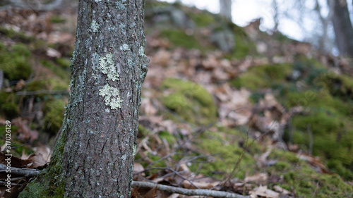 A tree trunk in focus with fall foliage and moss in the background, out of focus on a hill.