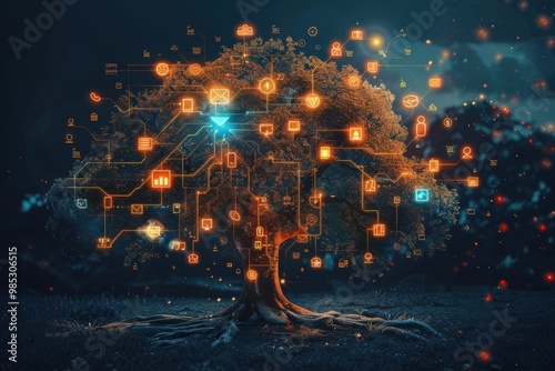 A tree with many branches and leaves, each branch has a different symbol or icon