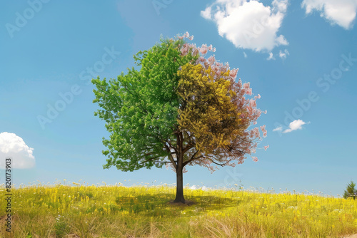 A tree with two different colored leaves, one green and one yellow