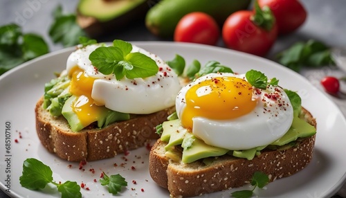 A trendy avocado toast with poached eggs and radish slices, sprinkled with chili flakes on sourdough
