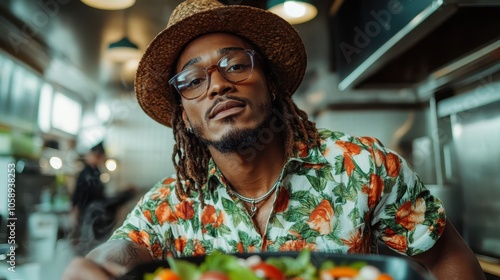 A trendy individual in a floral shirt and hat poses confidently in a kitchen, showcasing a vibrant salad bowl, embodying healthy living and fashion-forward style.
