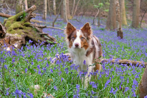 A tri red merle border collie standing in a woodland filled with bluebells.