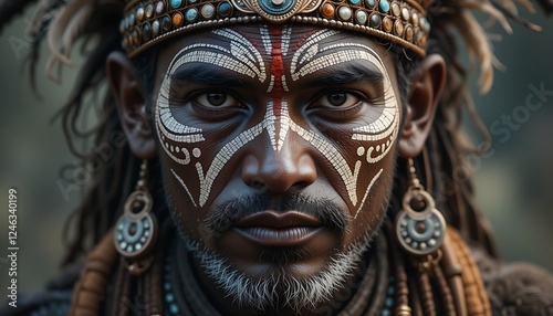 A tribal man with intricate face paint, adorned with traditional jewelry and headgear, reflecting deep cultural heritage.