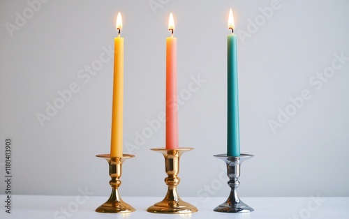 A trio of colorful taper candles in elegant holders on a clean white surface