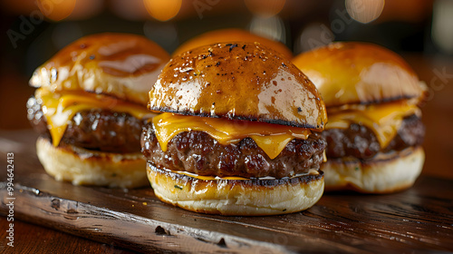 A trio of mini sliders with beef patties and cheese, captured using an ultra HD camera with a ring light for even illumination