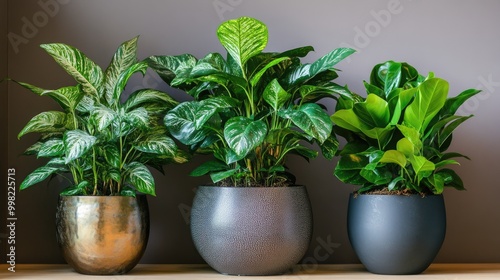 A trio of potted plants in bold, eye-catching containers, each plant offering a different shape and texture of green foliage.