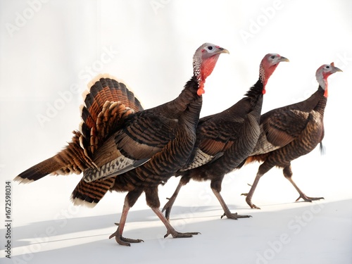 A trio of turkeys strides confidently, their plumage displayed against an isolated on white background, embodying the essence of thanksgiving