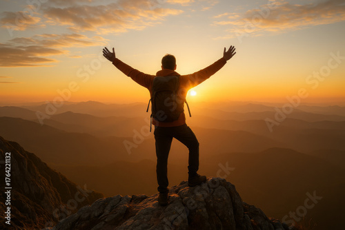 A triumphant hiker stands on a mountain summit with arms outstretched, silhouetted against a spectacular golden sunrise