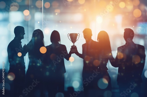 A trophy stands tall among cheering silhouettes as vibrant lights and confetti fill the high rise place with corporate pride.