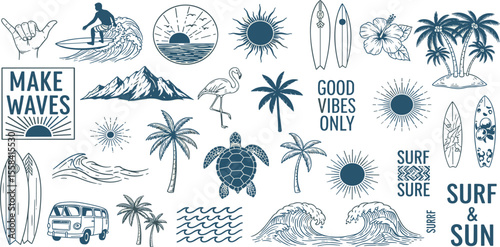 A tropical beach and surf-themed vector set with palm trees, waves, surfboards, a van, flamingos, and ocean elements with quotes, in a bold graphic style. Perfect for t-shirt prints, posters, stickers