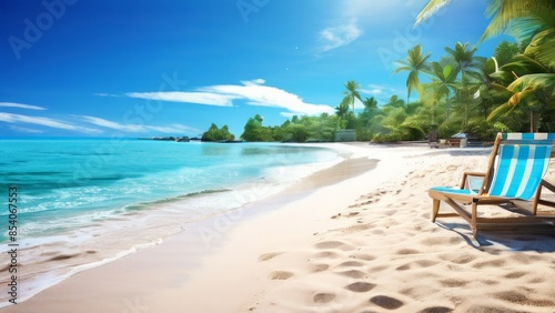 A tropical beach with clear blue skies, a calm ocean with clear turquoise water and a white sandy beach.
