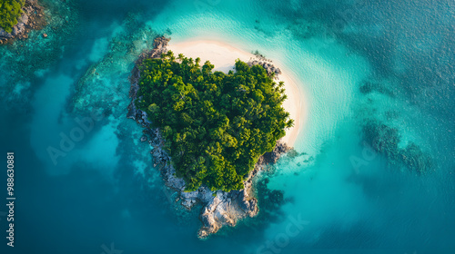A tropical island with lush vegetation and pristine beaches surrounded by turquoise waters.