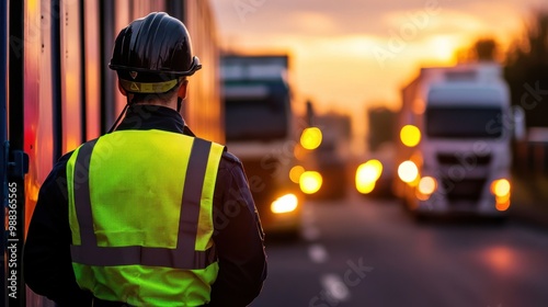 A truck driver in a reflective vest oversees a busy roadway at sunset, highlighting safety in transportation.