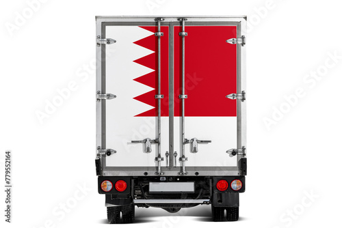 A truck with the national flag of Bahrain depicted on the tailgate drives against a white background . Concept of export-import, transportation, national delivery of goods