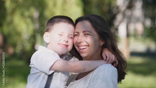 A truly heartwarming moment captured between a smiling mother and her joyful son in a beautiful, serene outdoor setting