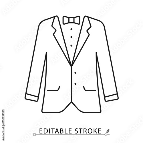 A tuxedo suit icon in a minimalist line style with editable stroke. Groom wedding costume, formal wear, gentleman fashion garment, classic man clothing, marriage ceremony accessory.