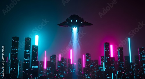 A UFO hovers above a city skyline, emitting a beam of light, with neon pink and blue lighting.