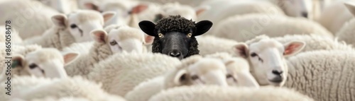 A unique black sheep stands out among a flock of white sheep, highlighting the concept of individuality and diversity in nature.