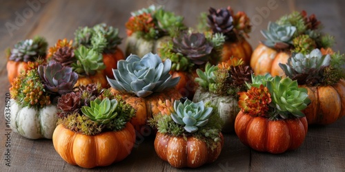 A Unique Collection of Colorful Succulent Plants Arranged in Adorable Miniature Pumpkins for a Charming Autumn Display