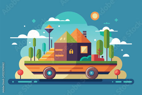 A unique house on wheels drives through a colorful landscape filled with trees and clouds, Stumble Customizable Semi Flat Illustration