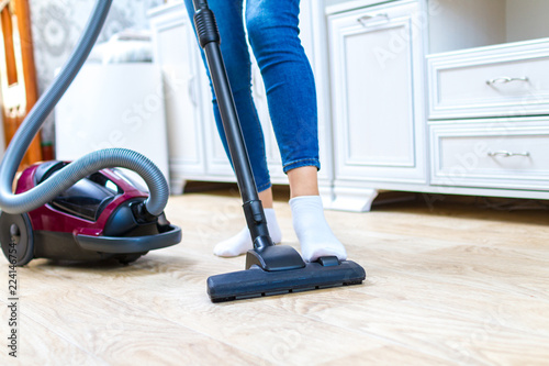 A vacuum cleaner. Room cleaning. Young woman cleaning the floor in the living room with a vacuum cleaner