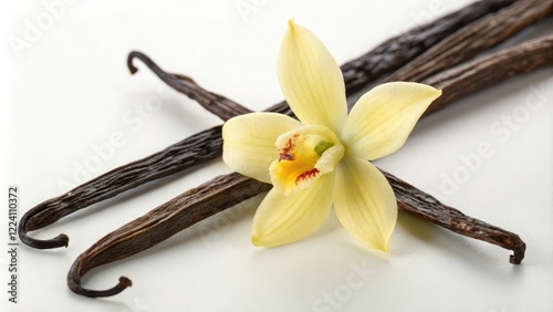 A vanilla bean is wrapped around a yellow flower stem, forming a unique and artistic pattern, party decor, floral motif