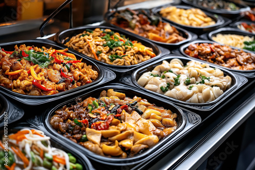 A variety of Asian dishes displayed in black trays at a self-service food counter. The dishes include noodles, stir-fried vegetables, and meat dishes with sauces.