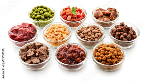 A variety of balanced pet food options, both wet and dry, displayed on an isolated white background, showcasing their nutrient-rich ingredients.