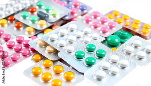 A variety of colorful pills in blister packs arranged together isolated with white highlights, png