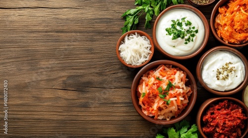 A variety of colorful side dishes in bowls on a wooden table, featuring creamy dips and vibrant vegetables, garnished with herbs.