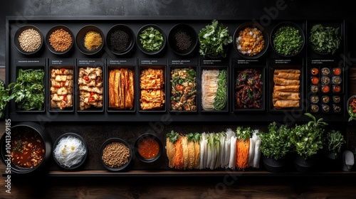 A variety of delicious Asian cuisine food bowls are shown. The food is presented in a visually appealing manner.